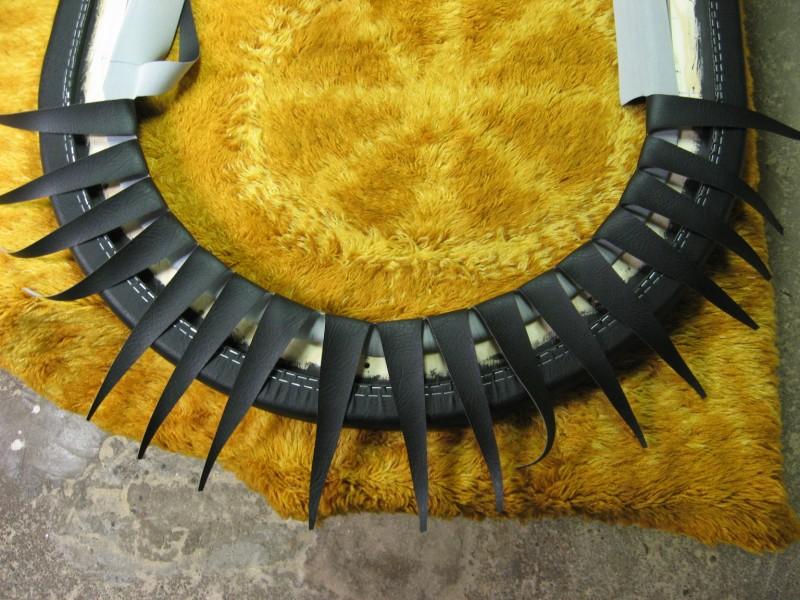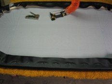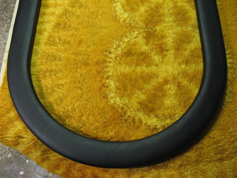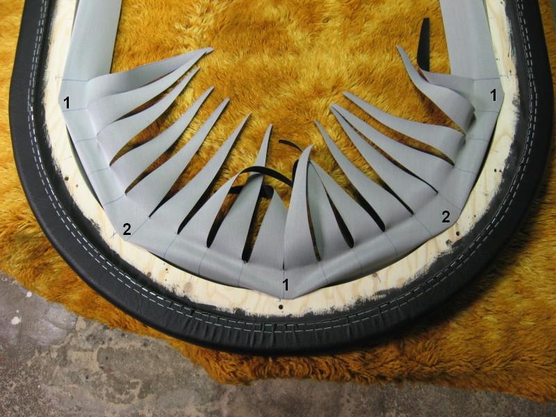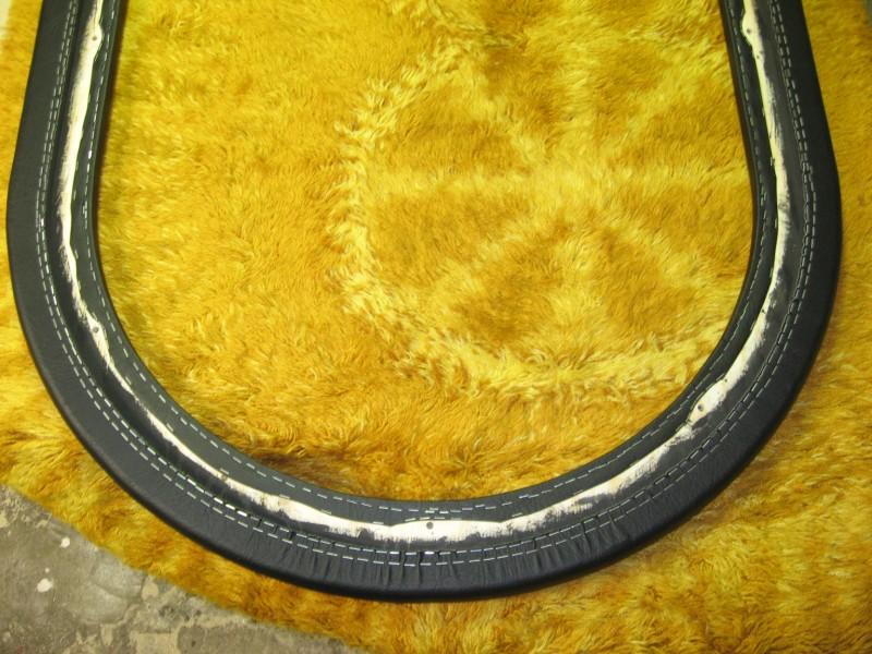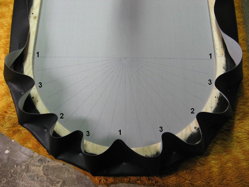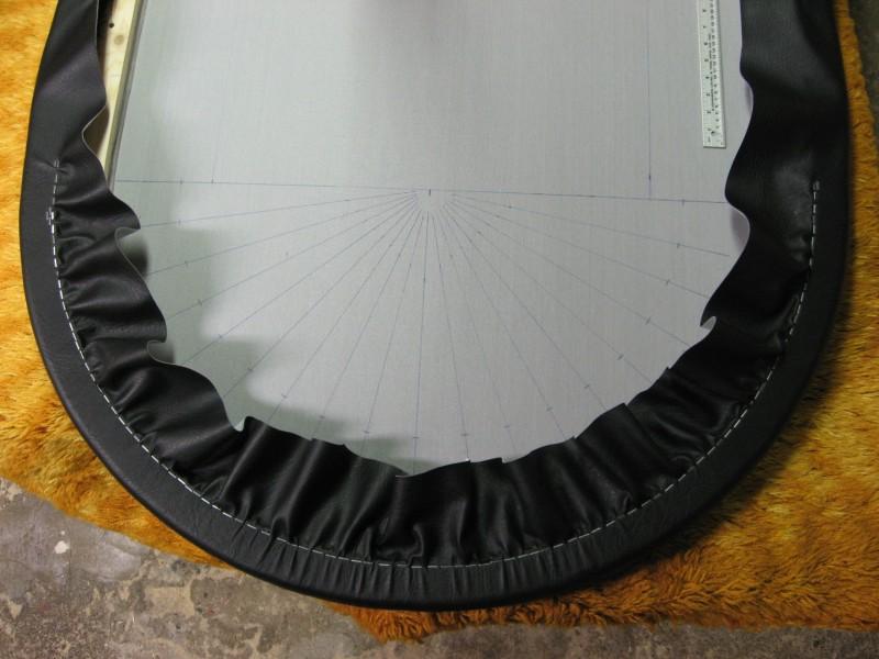 Ensin laitetaan nahka tasaiselle alustalle pohjapuoli ylöspäin ja pehmustereuna sen päälle pehmustepuoli alaspäin. Kokeile paljonko nahkaa tarvitsee tulla reunojen yli jotta sitä saa vielä käsin kiristettyä, sitten merkitään ja leikataan kaarien kohdalta ylimääräiset pois.