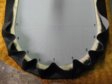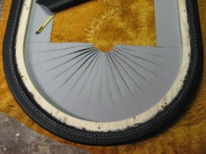 Sisäreunaa varten kannattaa piirtää apuviivoja joita pitkin nahka leikataan. Ensin taas katsotaan paljonko nahkaa täytyy jättää ylimääräistä jotta siitä pystyy pitämään vielä kiristettäessä kiinni. Päätyjä varten tarvitaan astemittaa jolla merkitään leikattavat suikaleet. Aloitetaan jälleen nitomalla ensin kaaren keskikohta ja seuraavaksi kaarien alkupäät. Tälläkin kerralla seuraavat niitit laitetaan aina kahden edellisen puoliväliin kunnes koko reunus on nidottu. Lopuksi leikataan ylimääräiset nahat pois.